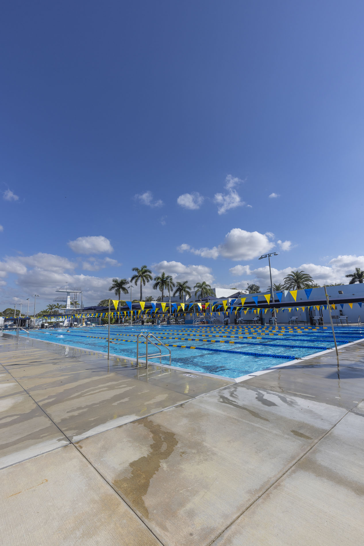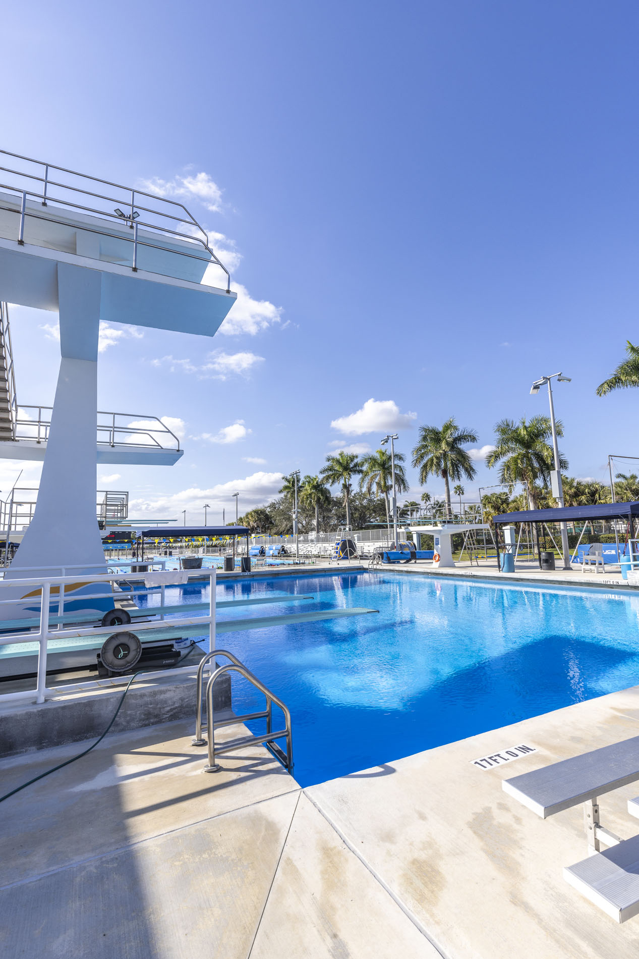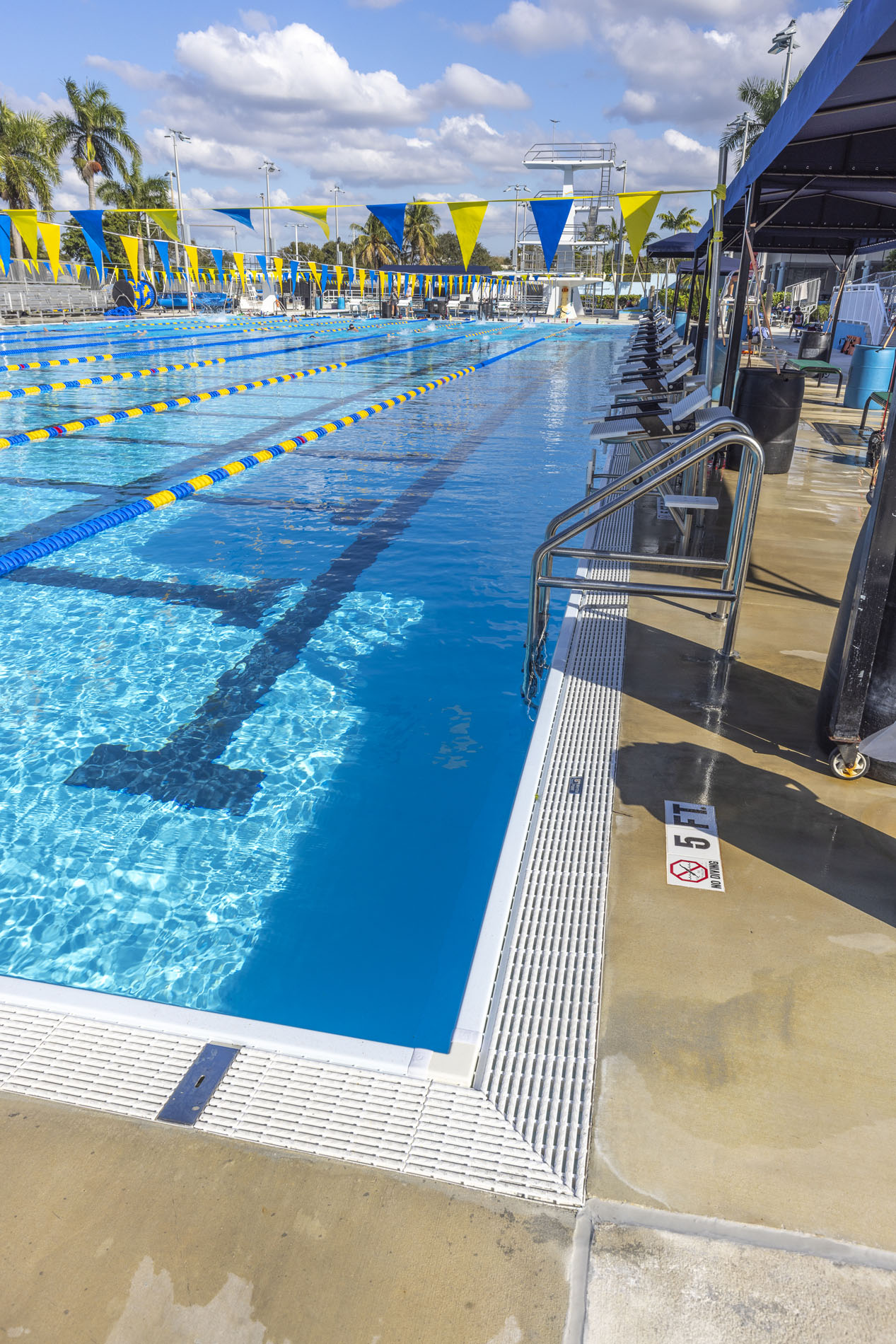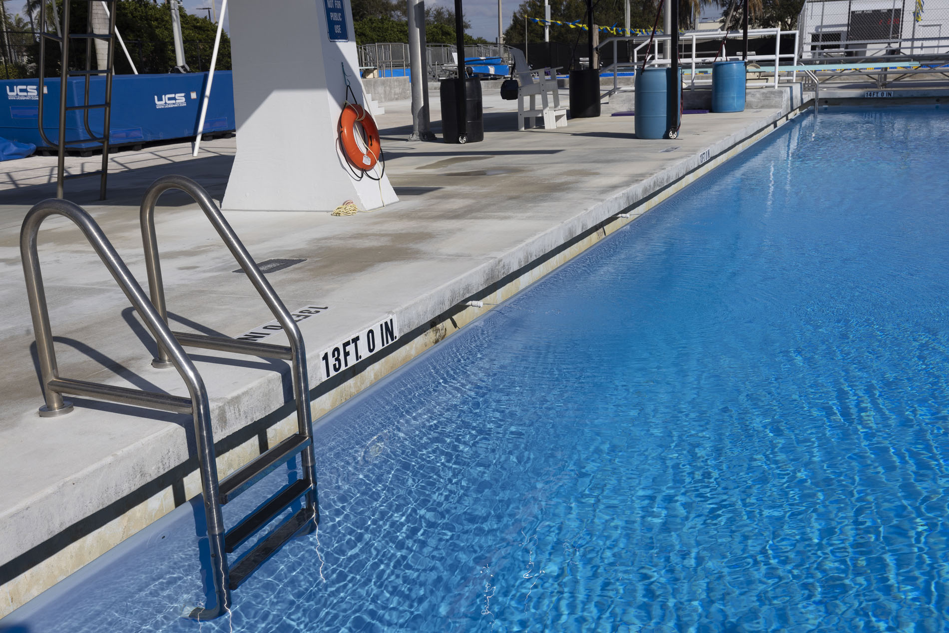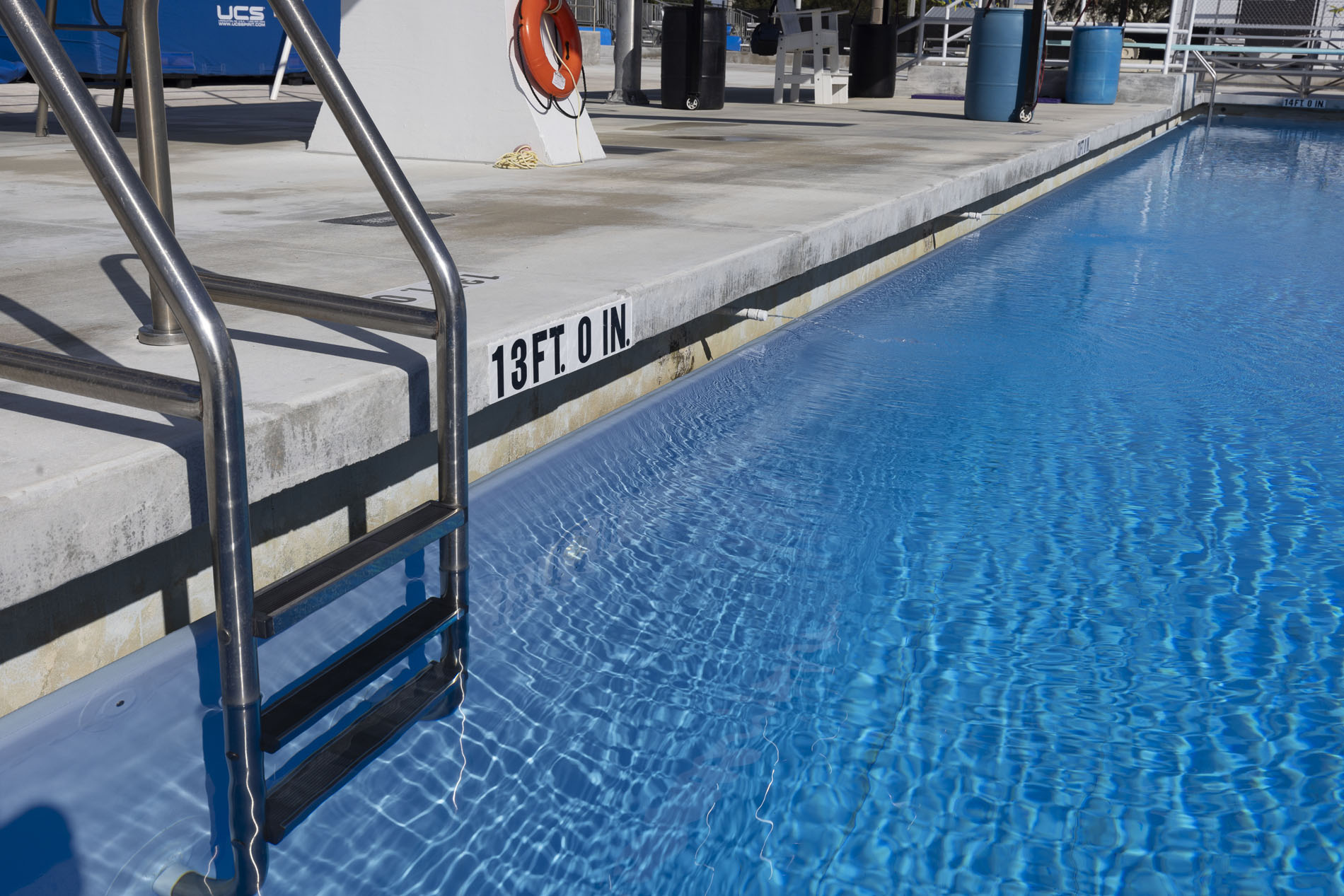The repair or replacement of most of the concrete decking, installation of new fencing and railing throughout the complex, repair of gutter top curbs on the dive pool and 25 meter pool, replacement of the swim starting platforms on both the 25 meter and 50 meter pools, replacement of the existing one meter springboard pedestals and dive boards, installation of new deck drains and piping, installation of depth markers and required signage, and repairs and replacement of the upper deck retaining walls and planter walls.