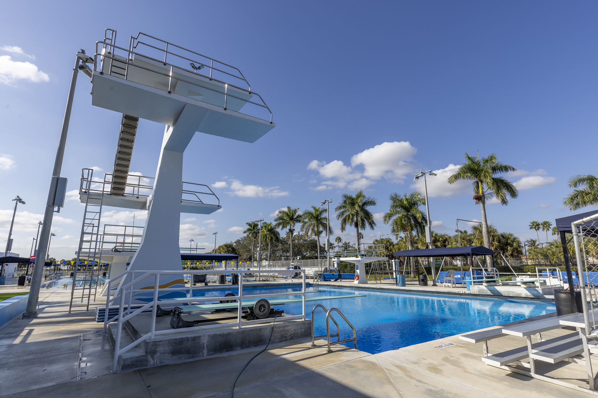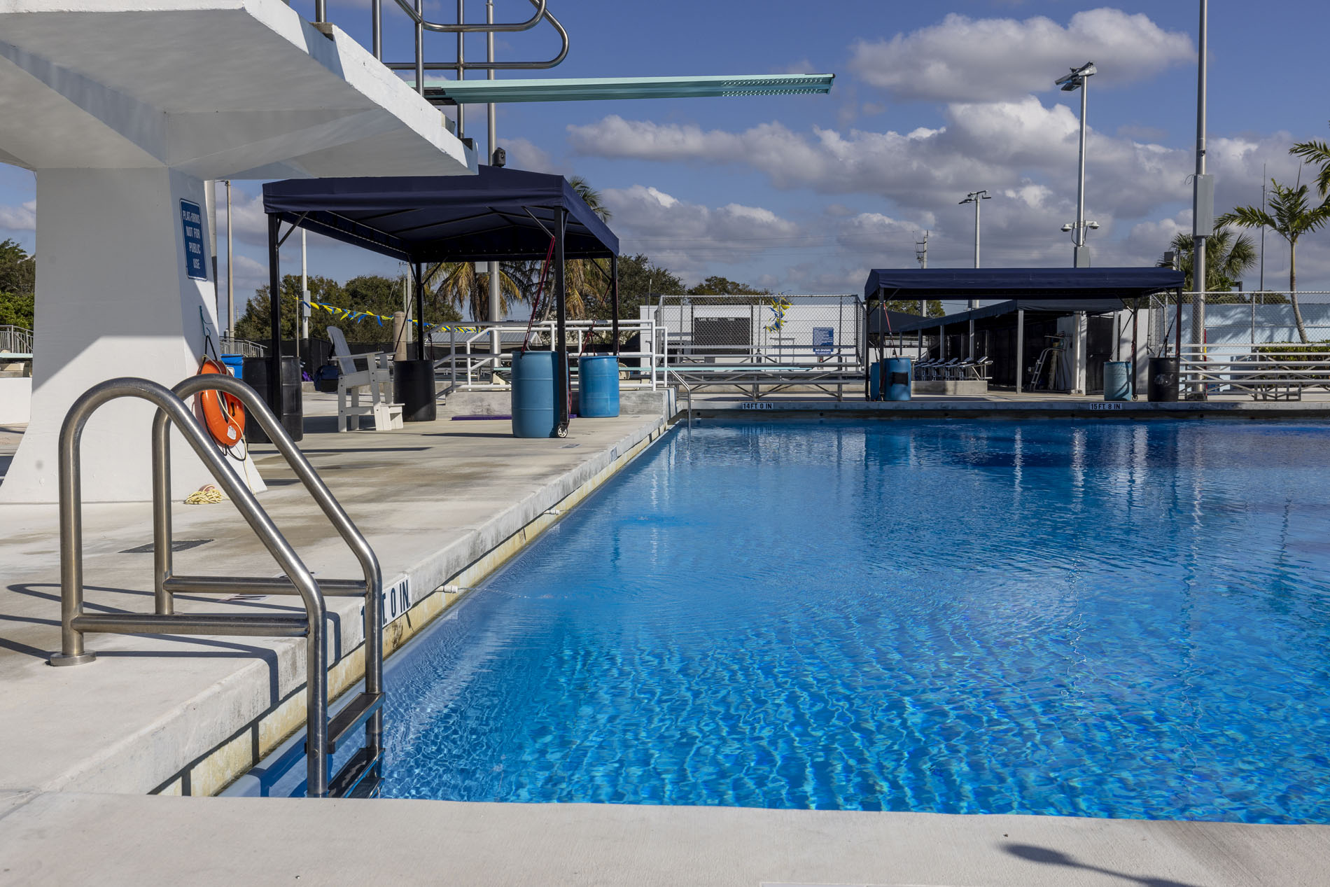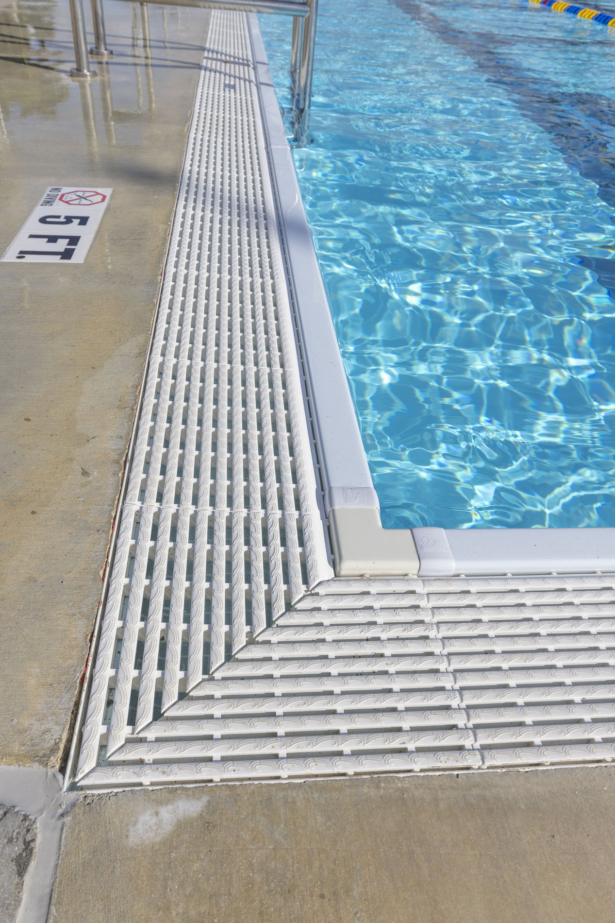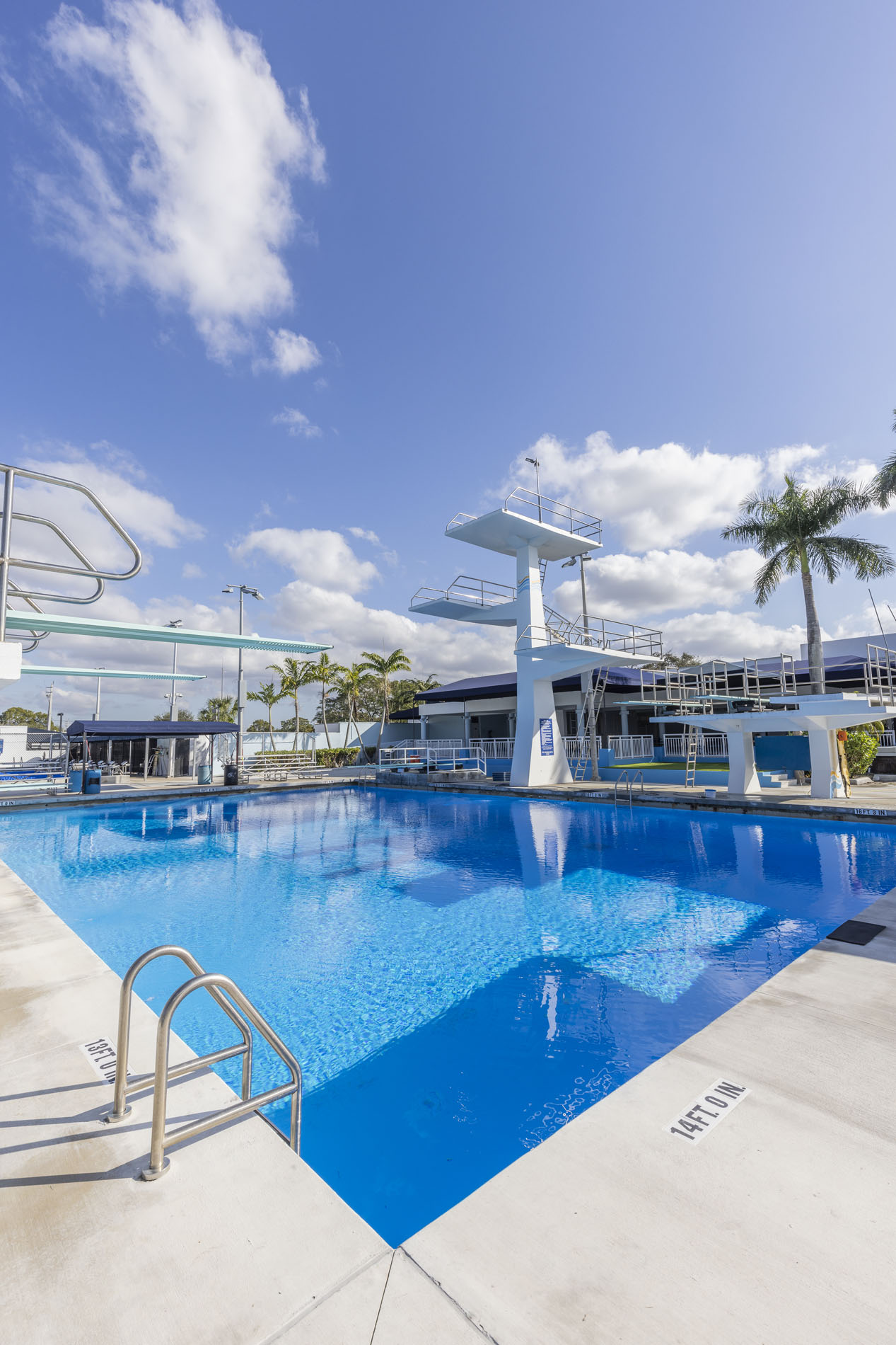 The repair or replacement of most of the concrete decking, installation of new fencing and railing throughout the complex, repair of gutter top curbs on the dive pool and 25 meter pool, replacement of the swim starting platforms on both the 25 meter and 50 meter pools, replacement of the existing one meter springboard pedestals and dive boards, installation of new deck drains and piping, installation of depth markers and required signage, and repairs and replacement of the upper deck retaining walls and planter walls.