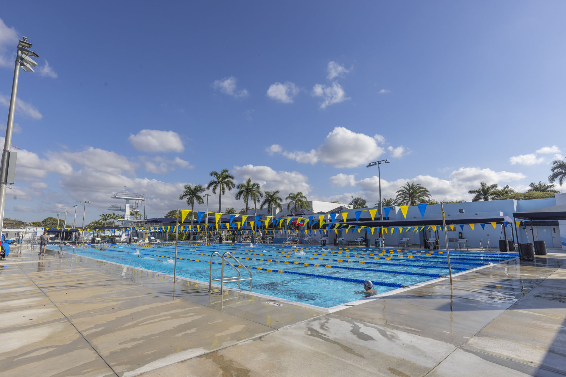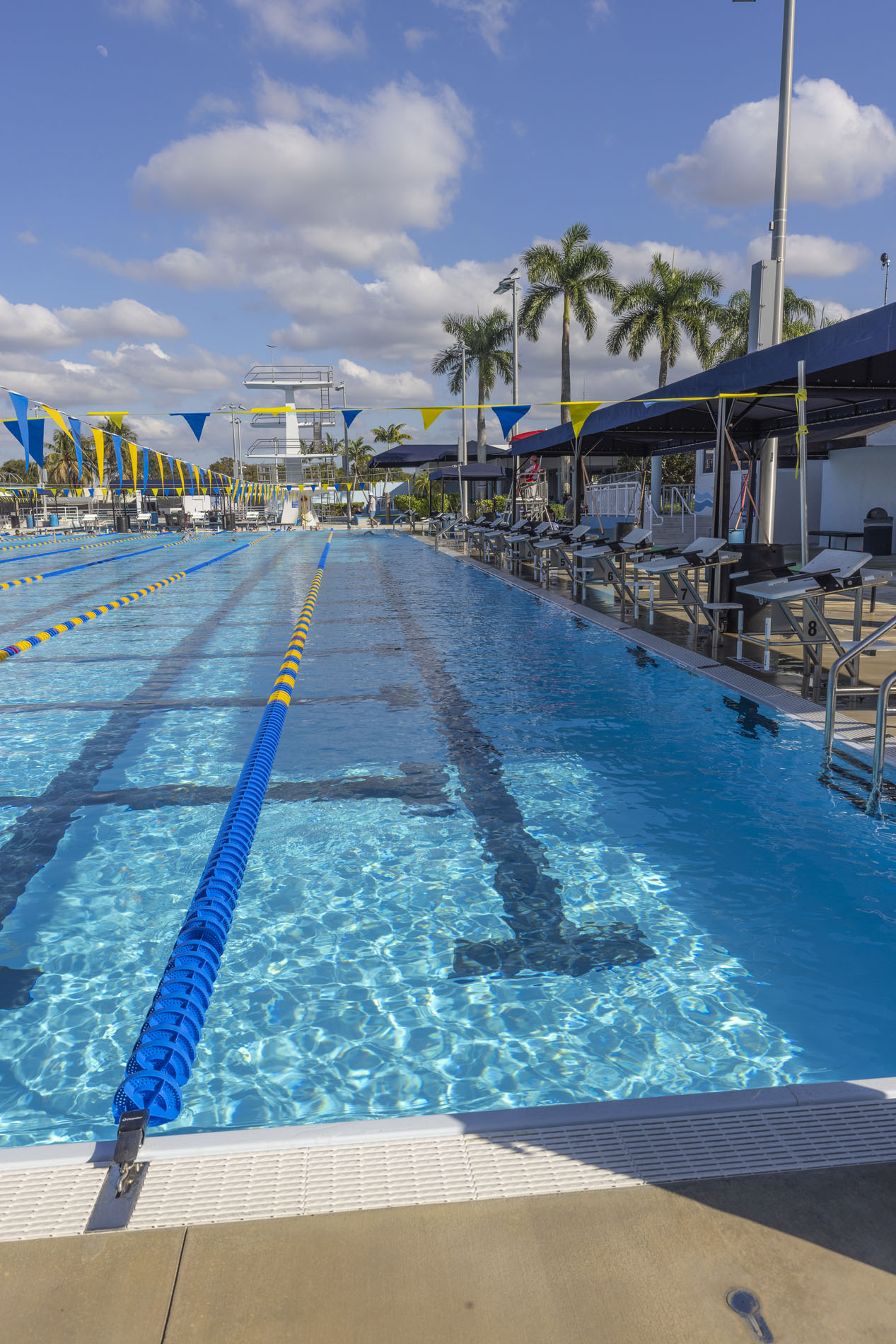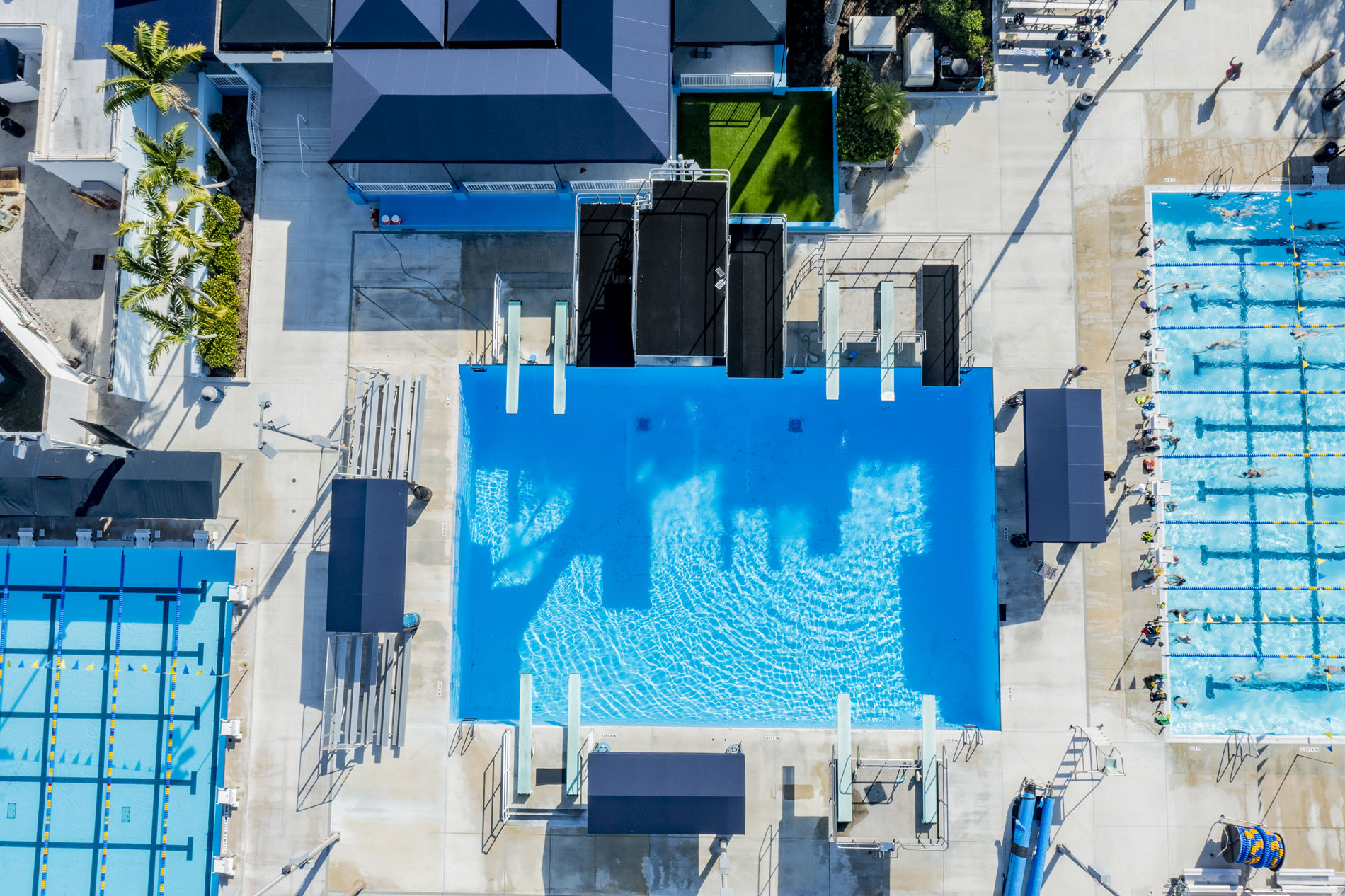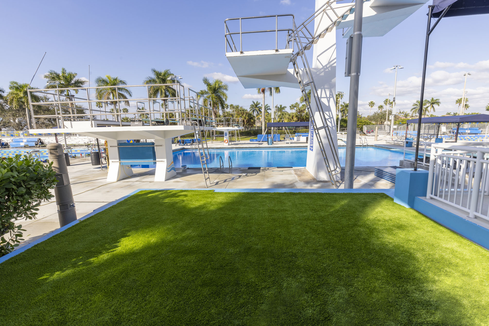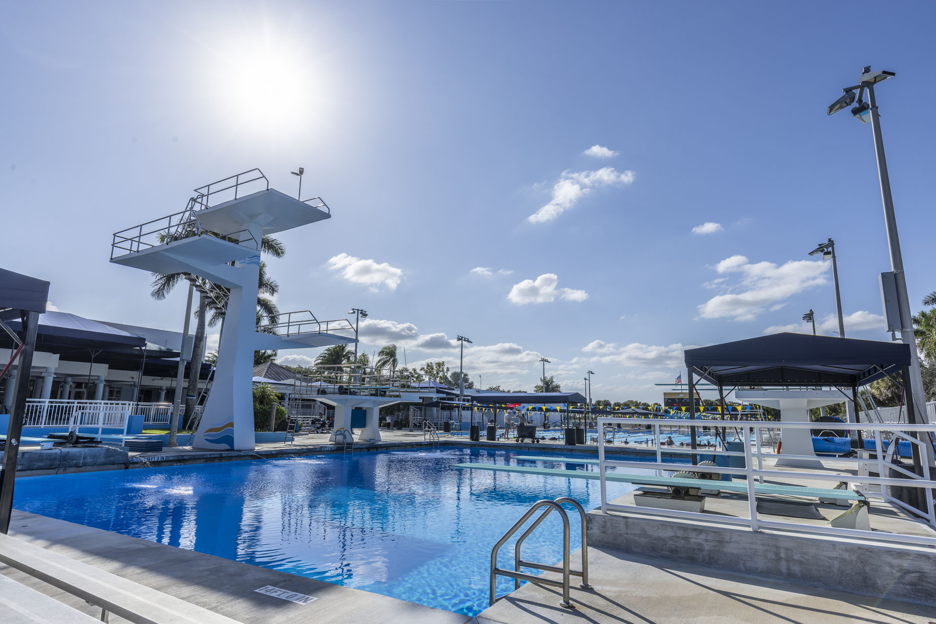 The repair or replacement of most of the concrete decking, installation of new fencing and railing throughout the complex, repair of gutter top curbs on the dive pool and 25 meter pool, replacement of the swim starting platforms on both the 25 meter and 50 meter pools, replacement of the existing one meter springboard pedestals and dive boards, installation of new deck drains and piping, installation of depth markers and required signage, and repairs and replacement of the upper deck retaining walls and planter walls.