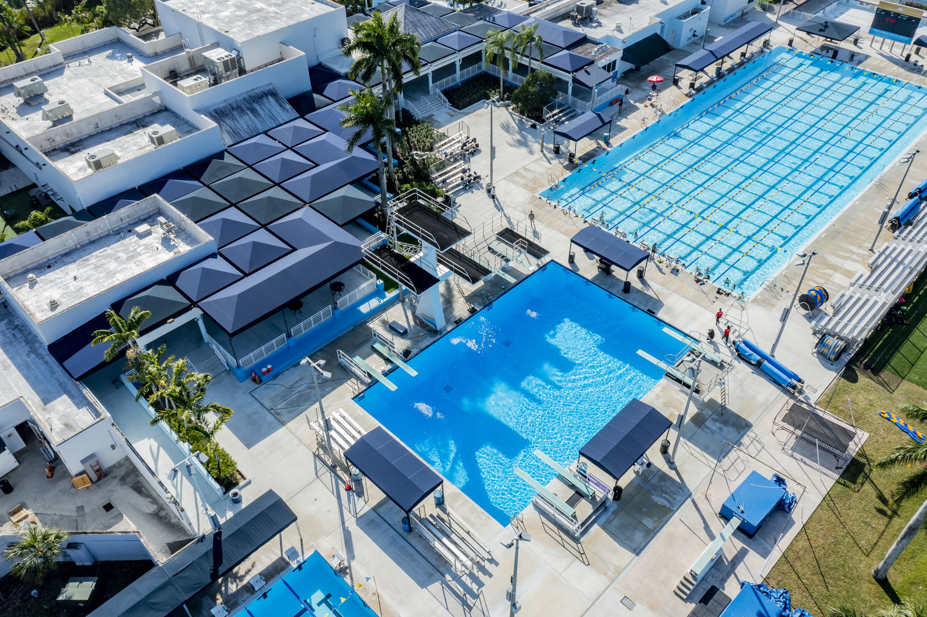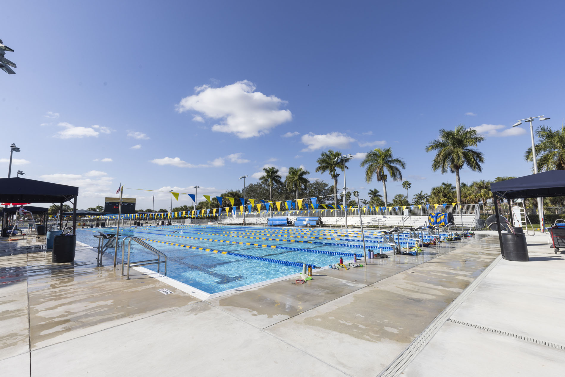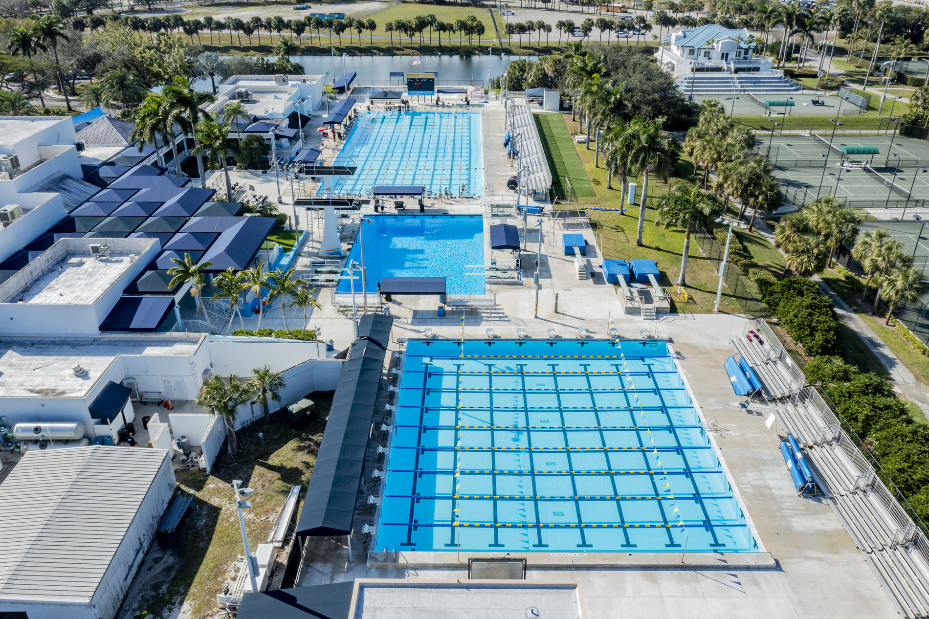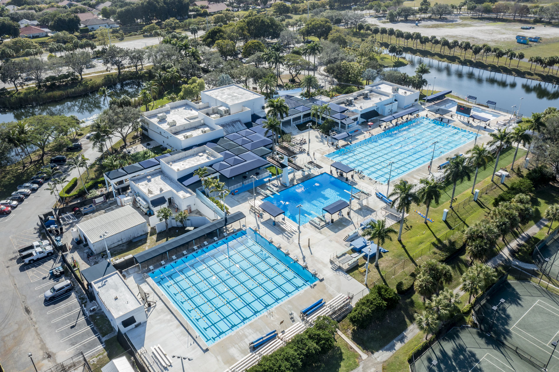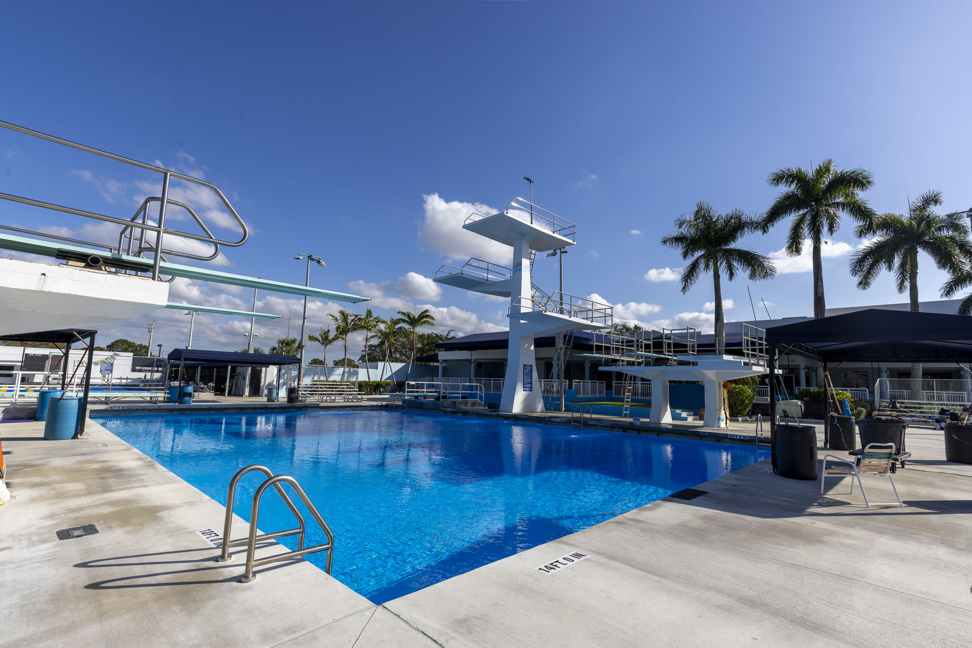 The repair or replacement of most of the concrete decking, installation of new fencing and railing throughout the complex, repair of gutter top curbs on the dive pool and 25 meter pool, replacement of the swim starting platforms on both the 25 meter and 50 meter pools, replacement of the existing one meter springboard pedestals and dive boards, installation of new deck drains and piping, installation of depth markers and required signage, and repairs and replacement of the upper deck retaining walls and planter walls.