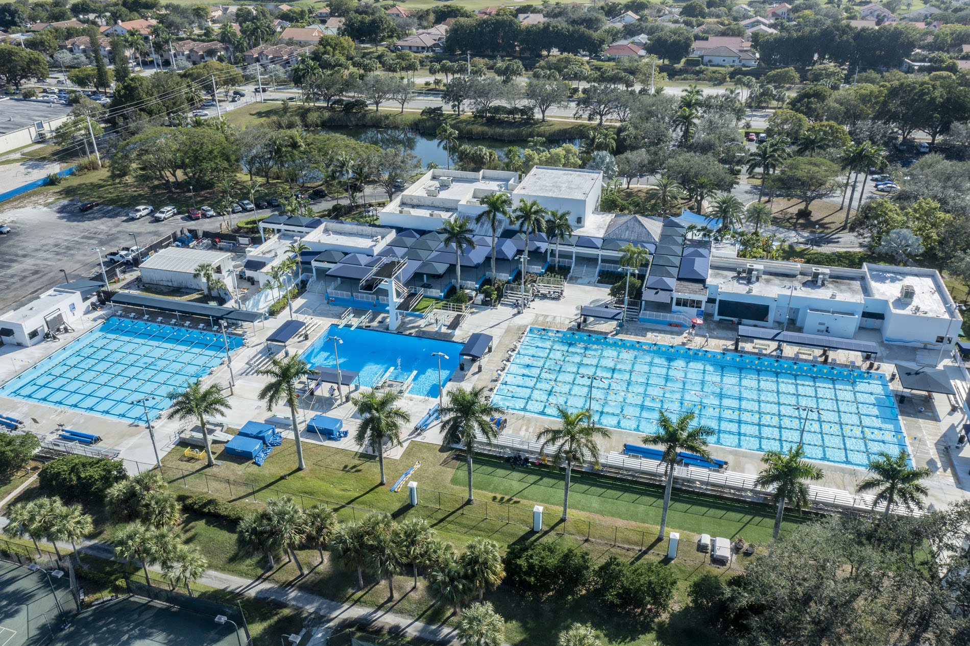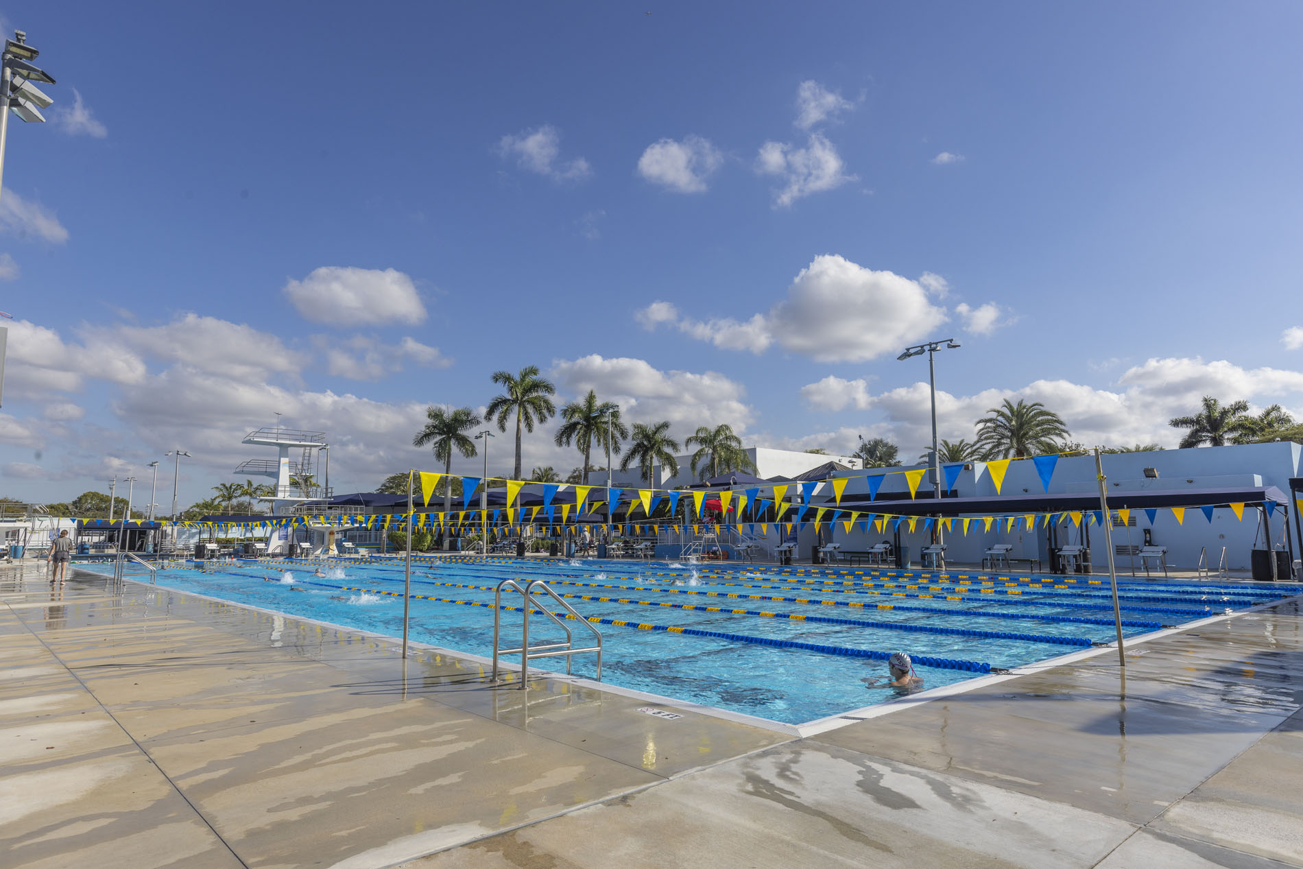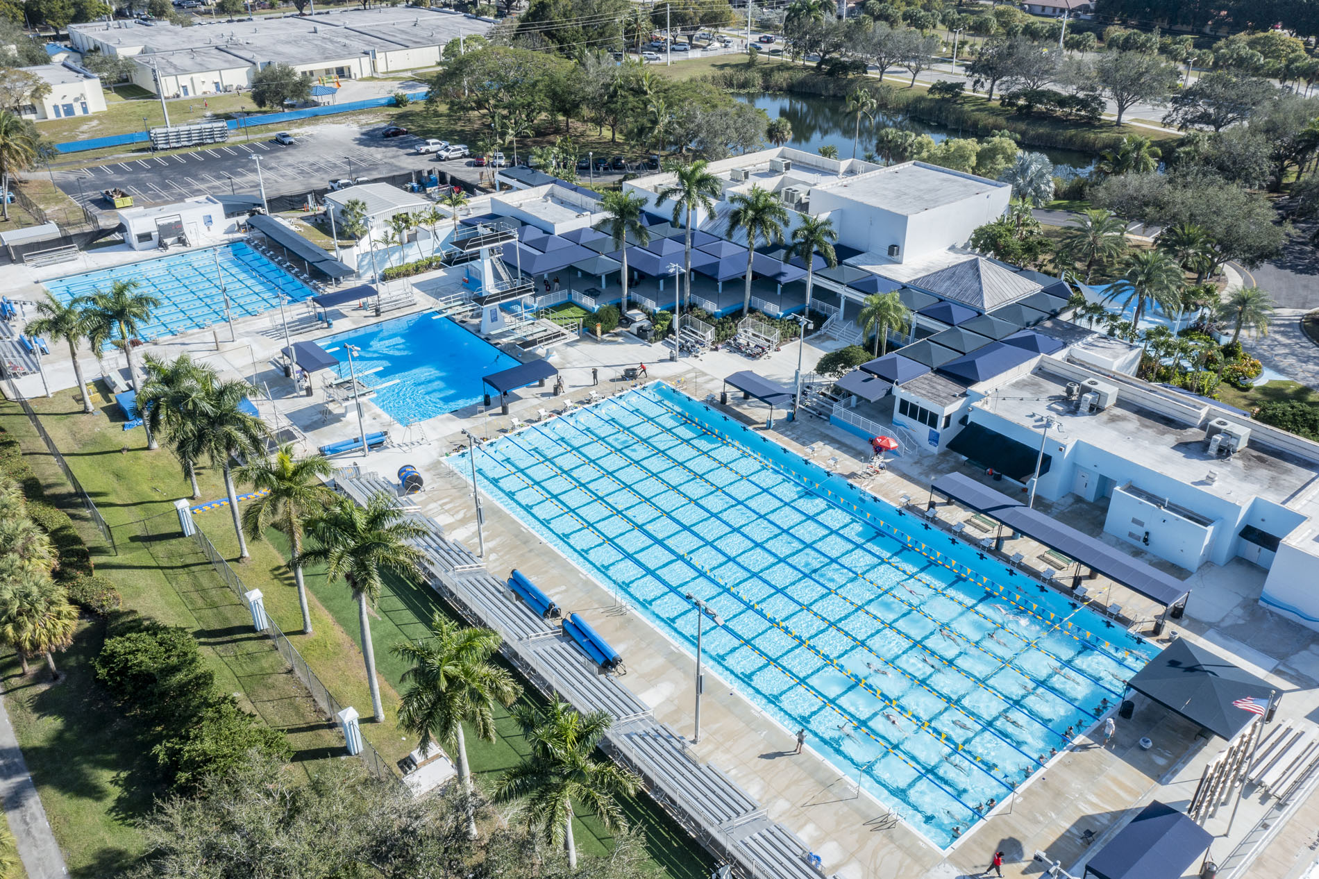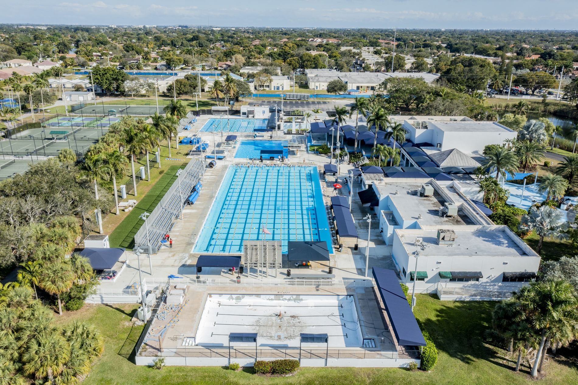 The repair or replacement of most of the concrete decking, installation of new fencing and railing throughout the complex, repair of gutter top curbs on the dive pool and 25 meter pool, replacement of the swim starting platforms on both the 25 meter and 50 meter pools, replacement of the existing one meter springboard pedestals and dive boards, installation of new deck drains and piping, installation of depth markers and required signage, and repairs and replacement of the upper deck retaining walls and planter walls.