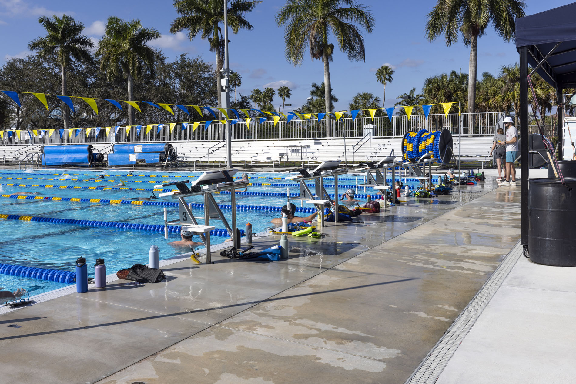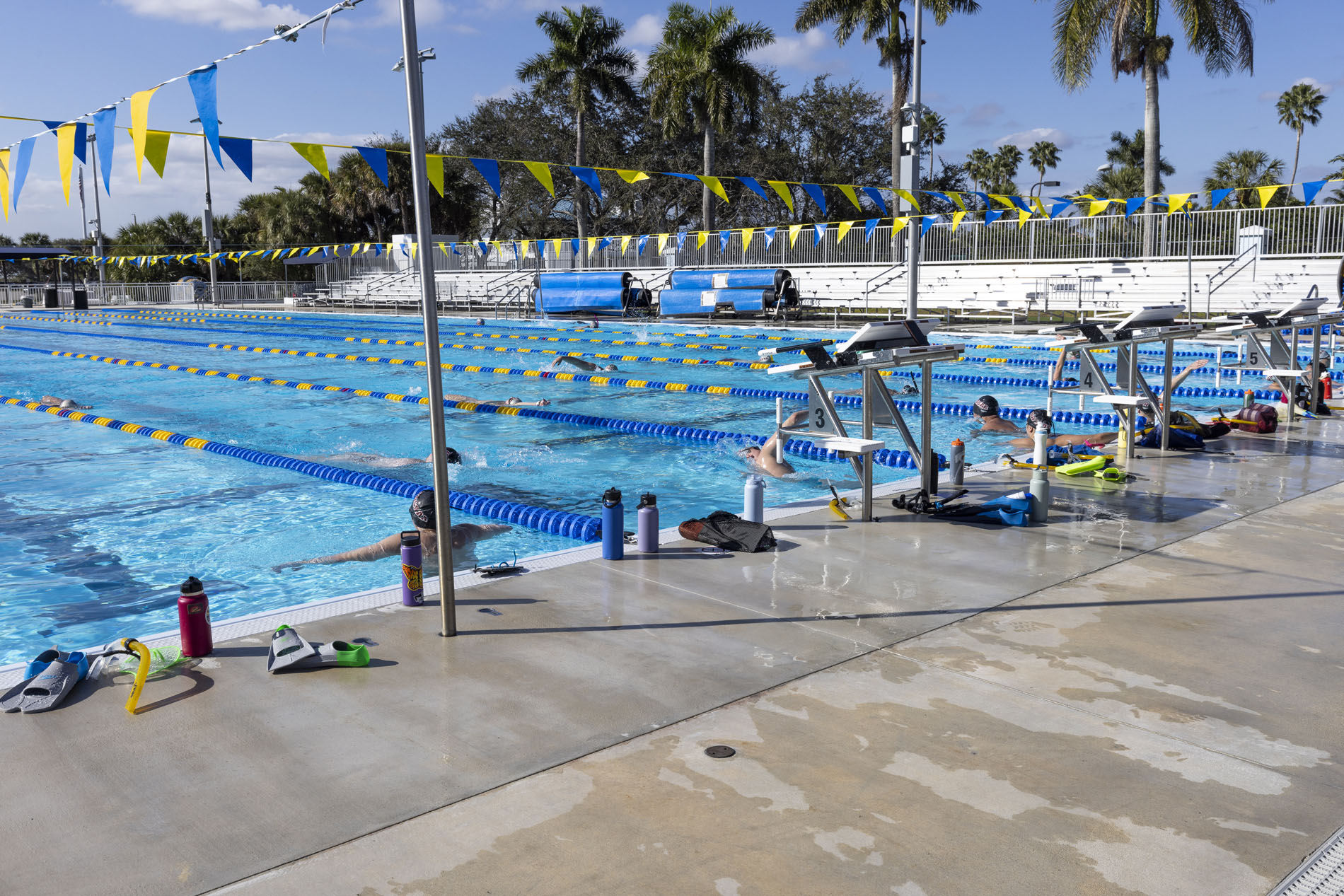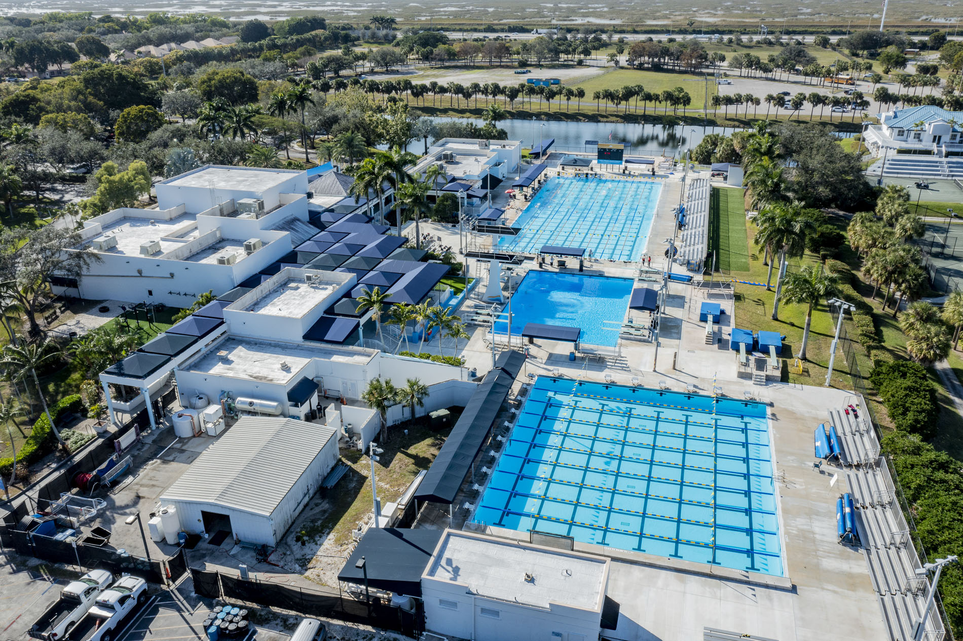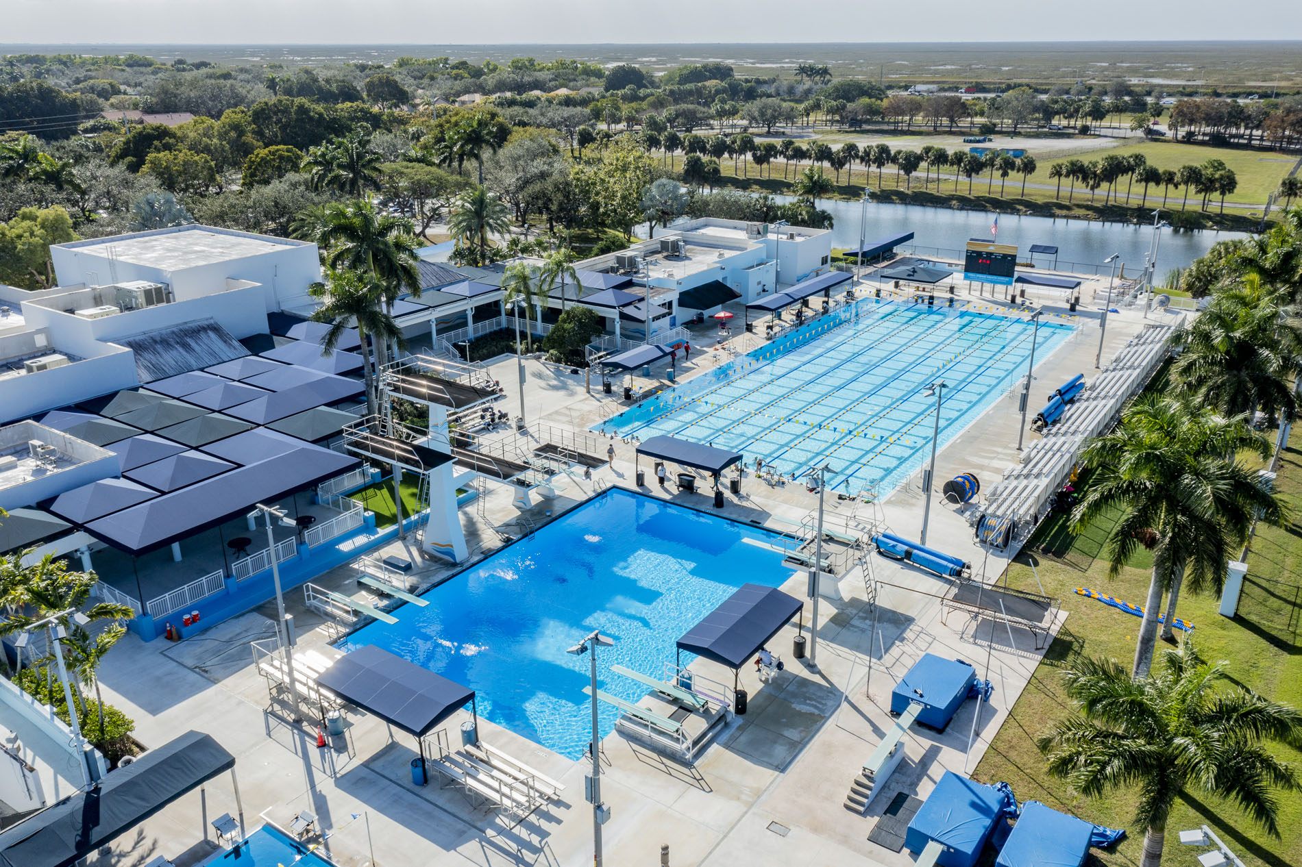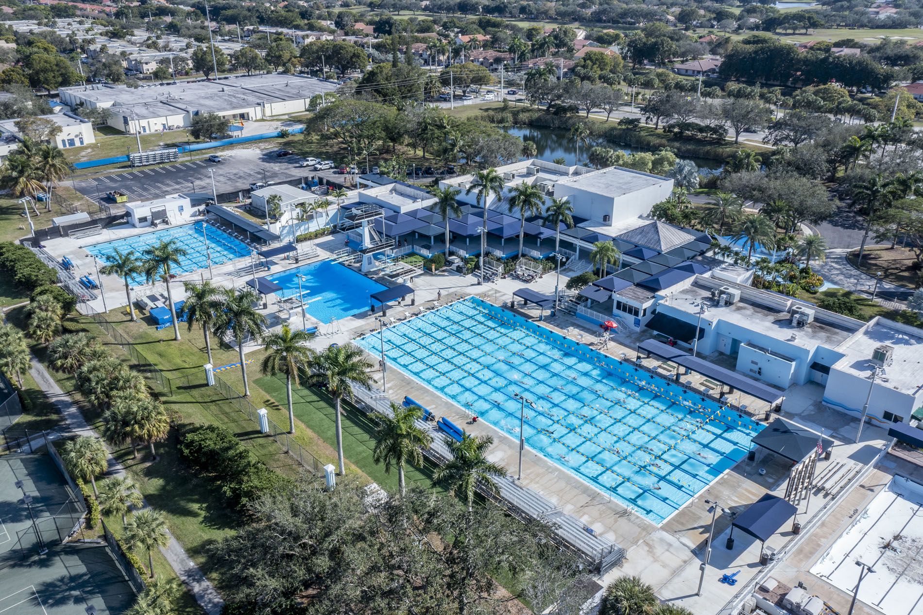The repair or replacement of most of the concrete decking, installation of new fencing and railing throughout the complex, repair of gutter top curbs on the dive pool and 25 meter pool, replacement of the swim starting platforms on both the 25 meter and 50 meter pools, replacement of the existing one meter springboard pedestals and dive boards, installation of new deck drains and piping, installation of depth markers and required signage, and repairs and replacement of the upper deck retaining walls and planter walls.